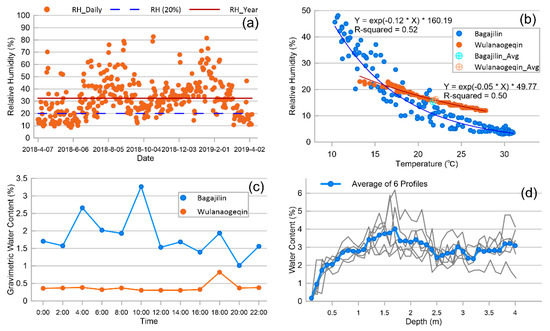 (a) Relative humidity from the automatic weather station of Sumubarunjilin (Figure 1b) from 7 April 2018, to 6 April 2019. Solid line is the average (32.4%). Dashed line represents the minimum relative humidity (20%) when water vapor adsorption occurs [30]. (b) Scatter plot showing the relationship between air temperature and relative humidity in the lake basin (Bagajilin) and non-lake basin (Wulanaogeqin), and their average values and exponential fittings. The linear distance of the two observation sites was approximately 3.2 km. (c) Variation of gravimetric water content of the surface sand layer in the lake basin and non-lake basin over 24 h. Data were recorded in China Standard Time, which is approximately 1 h 10 min before Local Time. (d) Water content of six profiles with depths of 4 m on the leeward slope of a dune in the lake group area, and their average [38].