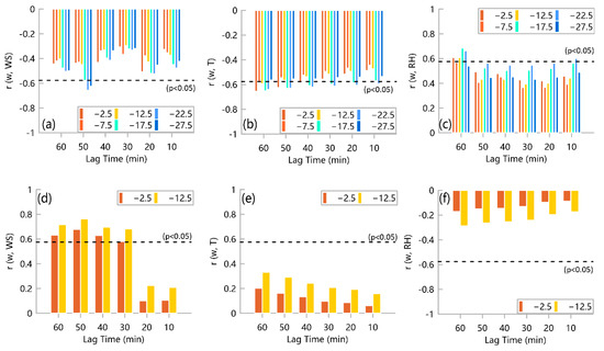 Considering data completeness, we selected the time series of the water content of all 6 layers of the lake basin and layers 1 (0–5 cm) and 3 (10–15 cm) of the non-lake basin for correlation analysis with the time series of meteorological elements. In addition, the time series of meteorological elements have 6 lagged moments from 10 min lag to 60 min lag at 10 min intervals. The results of the correlation analysis are as follows (Figure 8).