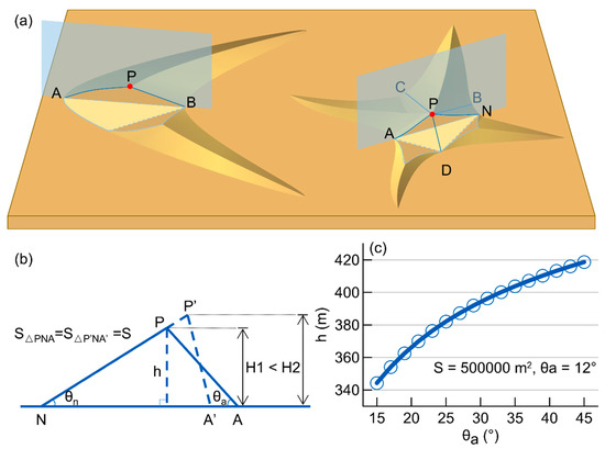 (a) Sketch of the relationship between the dune height and dune slope. (b) Line chart of θa and h incorporating the area of the triangle (referring to the dune volume) and assuming that S = 500,000 and that θn = 12°. (c) Sketch showing that the peak point of a dune (point P) is maintained by several slope faces, which are described by the maximum slope lines (PA, PB, PC, and PD). Among these slope line relationships, PN is coplanar with PA and plane PAN is perpendicular to the ground plane.