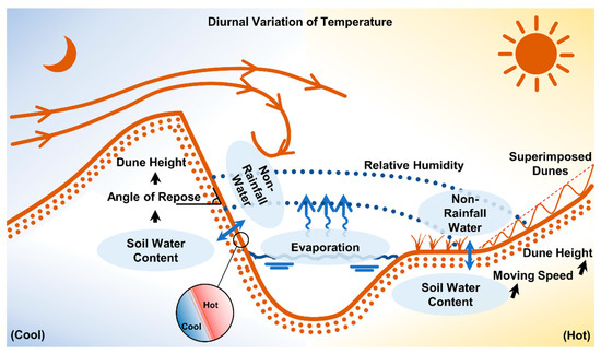 In terms of moisture exchange, the temperature gradient and moisture gradient at the interface between the soil and atmosphere are thought to be the driving forces [53,54]. In a typical desert area, the diurnal temperature difference provides the interface temperature gradient between the air and surface sand layer. In addition, during the daily warming period, owing to the small specific heat capacity of sand, when the surface temperature of sand dunes rises rapidly, the sub-surface temperature rises more slowly. Because of this, the temperature difference between the surface and sub-surface layers of sand dunes [55] causes some water vapor to migrate downward, instead of entirely evaporating into the atmosphere, which is therefore beneficial to the long-term maintenance of the water in the sand layer.