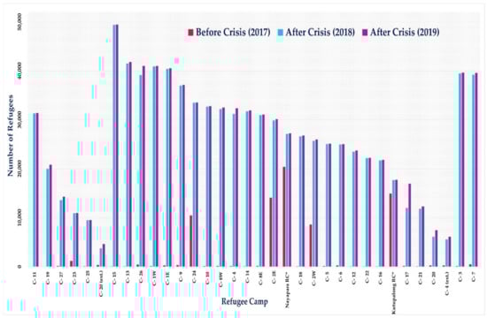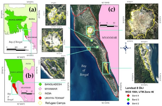 - Labib, S.M.; Hossain, N.; Patwary, S.H. Environmental Cost of Refugee Crisis: Case Study of Kutupalong Balukhali Rohingya Camp Site A Remote Sensing Approach. In Proceedings of the 26th Annual GIScience Research UK (GISRUK 2018), Leicester, UK, 17–20 April 2018. [Google Scholar] [CrossRef]
