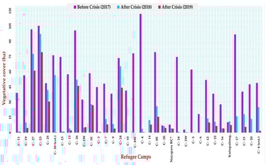 4.2. Expansion of Rohingya Refugee Settlement and Decline of Vegetative Cover among All Thirty-Four Refugee Camp Areas, the Situation of Pre and Post Rohingya Refugee Crisis, 2017–2019