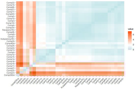 | 3 | −0.19 | −0.30 | −0.28 | −0.26 | Camp 1E, Camp 1W, Camp 2E, Camp 2W, Camp 3, Camp 4, Camp 4 (extension), Camp 5, Camp 6, Camp 7, Camp 8E, Camp 8W, Camp 9, Camp 10, Camp 12, Camp 13, Camp 14, Camp 15, Camp 16, Camp 17, Camp 18, Camp 20, Camp 21, Camp 22, Camp 24, Camp 26, Nayapara-RC, and Kutupalong-RC |