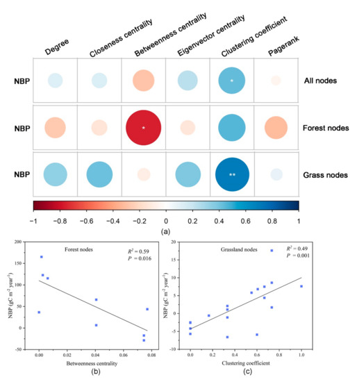 - The net carbon sequestration capacity of forest nodes in the YRB had a negative linear correlation with its betweenness centrality; the carbon sequestration capacity of grassland nodes had a positive linear correlation with its clustering coefficient.