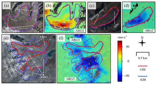 Examples of two ARGs only inventoried in KBI (a,b) and two ARGs only inventoried in GBI (c–f). The boundaries were overlaid on the Google Earth images (a,c,e) and InSAR surface velocity maps (b,d,f), respectively. The red and blue polygons show the outlines mapped by the geomorphic-based and kinematic-based approaches, respectively. The rooting zones and frontal lobes of each ARG are also annotated.