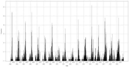 Daily frequencies of forest fire occurrences (from 2003 to 2019).
