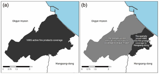 Spatial join process for a forest fire across the boundary of two administrative divisions: (a) forest fire damage range in Okgye-myeon and Mangsang-dong, (b) divisions of the forest fire damage range to calculate LITB.