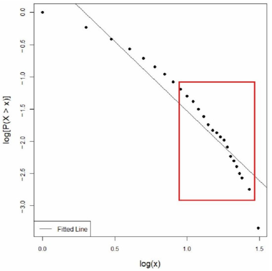 One of the important features of the power law is that looking at the normal distribution curve, the frequency of special events is very small, whereas in the power function graph, the frequency does not decrease rapidly. This phenomenon is called “Thick Tail” of the power law. In Figure 5, the CCDF was obtained using the daily forest fire occurrence frequency data and according to the results, the distribution formed a thick tail (right side box in Figure 5), and the explanatory power for the estimated power exponent was shown to be statistically significant. Therefore, it could be seen that the forest fire occurrence time series data follow the power law distribution, indicating that the forest fire occurrences are irregular in time series and that forest fires may burst on certain dates. In other words, it was identified that the daily forest fire occurrence frequencies shown in the forest fire damage ledger follow the SOC mechanism taking the form of a power law distribution.