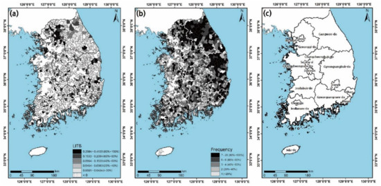 Results of analysis of LITBs of 3 regions in Gangwon-do: (a) Toseong-myeon (0.0851) in Goseong-gun, (b) Okgye-myeon (0.2600) in Gangneung-si, (c) Nam-myeon (0.2644) in Inje-gun.