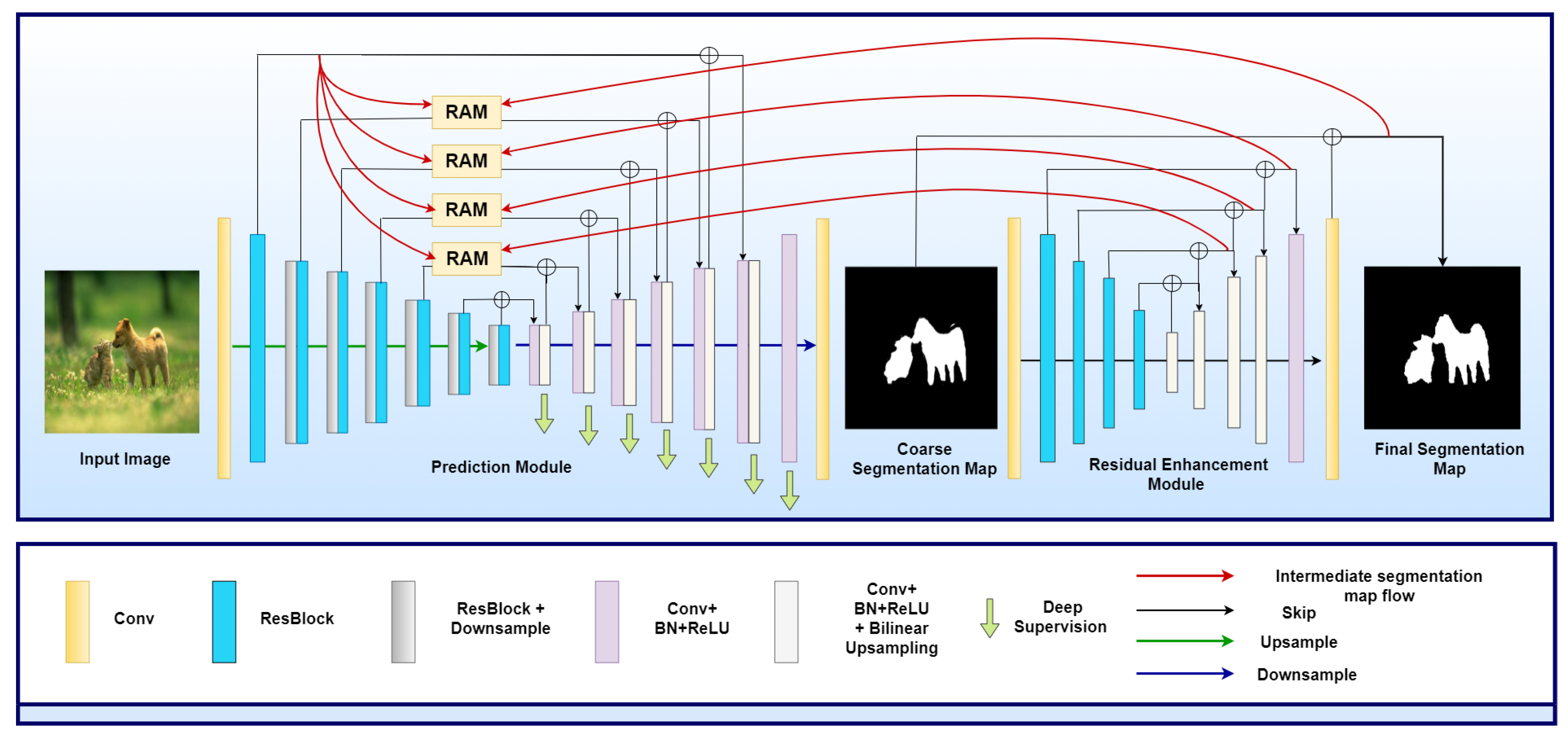 - The intermediate segmented maps generated in each decoding layer of the REM are utilized to attentively guide the PM via RAMs on multiple scales cascaded between the two networks.
