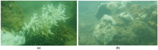 Coral bleaching on the Paipu coast. (a) Acropora, 23 August 2020; (b) Favites, 15 September 2020.