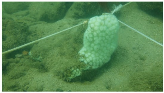 The field investigation showed that severe coral bleaching occurred in this area in summer 2020 (Figure 2). The field survey method in this study is mapped quadrats [16]. For the area with high coral coverage, we used nylon line to produce the 10 × 10 m quadrats and subdivided them equally into 2 × 2 m squares. Figure 3 shows part of the quadrat. All corals in quadrats were photographed with a camera. We counted from the photos to calculate the bleaching rate, mortality rate, algal coverage after coral death, and the total number of corals. For areas with low coral coverage, we directly counted to calculate the coral bleaching rate, mortality rate, and algal coverage after coral death. The field investigations were carried out on 23 August, 15 September and 17 November. According to the field observations, the coral bleaching rate ranged from 86% to 98%, and the comprehensive bleaching rate was 92%. The coral bleaching rate refers to the ratio of bleaching corals to the total number of the corals at each quadrat. The comprehensive bleaching rate is the ratio of all bleaching corals sampled at all stations to the total number of all corals sampled at all stations. The main coral species distributed in the study area are Galaxea astreata, Porites lutea, and Favites. The depth of the corals is about 1.5–3 m. The mortality rate of bleached corals was 3% during the investigation, and Acropora was the main impacted coral.