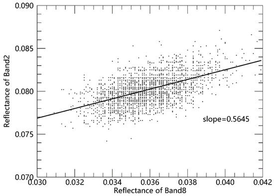 Sentinel-2B/MSI contains three spatial resolution bands, of which the resolutions of bands 02, 03, 04, and 08 are all 10 m (Table 1). Bands 02, 03, and 04 are visible bands. Band 08 is the NIR band that can be used to correct solar glint in these visible bands. A diagram of flare correction is shown in Figure 4, in which the scatter is BOA reflectance in bands 08 and 02 of the sample area, and the correction factor can be obtained by linear regression.