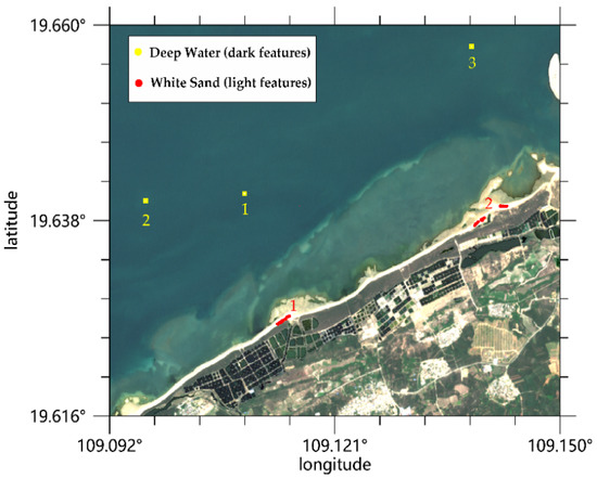 In the detection of coral bleaching changes, common pseudo-invariant features include deep water, algae, benthic sandy, white sand on shore, roads, building roofs, etc. The previous study comparison showed that the best normalization results could be obtained from the combination of deep water and white sand [13,26]. Therefore, three deep water areas as dark features and two shoreline white sand areas as bright features were selected, each of them including 25 feature points (Figure 5).