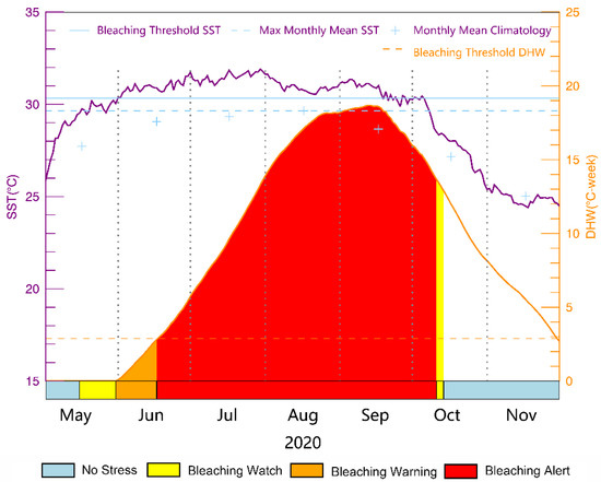 The MMM SST calculated from the long-term historical SST in the study area is 29.65 °C, and the critical threshold SST for coral bleaching is 30.33 °C using the method proposed by Liu et al. [10]. Figure 6 describes the maximum of 7 days’ coral bleaching thermal stress level, SST, and DHW in study area, and the drawing format refers to CRW [17]. SST exceeded the critical threshold starting on 31 May 2020, and this lasted up to three and a half months. From 31 May to 3 October, the average SST was 31.01 °C and the peak SST reached 31.91 °C. Correspondingly, with the accumulated heat, DHW exceeded the alarm threshold of 2.87 °C-weeks [10] on June 16 and remained at the bleaching alarm level until 5 October. The peak DHW reached 18.5 °C-weeks.