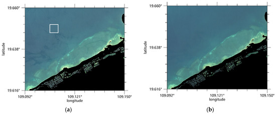 The Hedley method [22] was used to correct the solar glint in the visible light bands of each scene. Figure 7 contains the RGB images of 7 May 2020, before and after the glint correction; the white box area in Figure 7a is the sample area. Figure 7b shows that the wavy flares in the original image were essentially removed after correction.