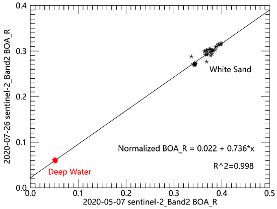 Radiation normalization using PIFs was performed on the basis of the image from 7 May 2020. Water depth was about 1.5 to 3 m. Band 02 radiation normalization diagrams between 7 May 2020, and 26 July 2020 are shown in Figure 8. BOA_R had an obvious linear correlation between the two dates, which proves that the appropriate pseudo-invariant feature point has been selected. Normalization can also satisfy the need for producing difference imagery. The normalized results for each visible spectral band of all images and the R2 evaluation are shown in Table 3.