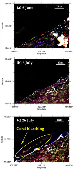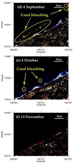 On the basis of difference image results, there was no significant change in the remote sensing reflectance of the coral reef areas on 6 June or 6 July. By 26 July, there were significant areas of coral bleaching. No images were available due to excessive cloud cover in August. The bleaching area on 4 September was larger than that on 26 July. We inferred that the severity of coral bleaching increased from the end of July to September, which is the stage of bleaching development. We found coral bleaching in the field survey in August and September. After comparing with the position of the image (the distance from the shore and the approximate area areal extent of the bleaching), we believe that the golden yellow pixels are actually bleaching corals. According to the field investigation on 17 November, 80% of dead corals grew algae after bleaching. On 4 October and 13 November, the bleaching detection area significantly decreased. The change was due to bleaching recovery and algae coverage, which is presumed to be in the late bleaching stage. Table 4 shows that the areal extent of detected bleaching area was 0.0664, 0.1079 and 0.0041 km2 on 26 July, 4 September, and 4 October respectively.