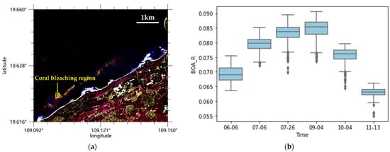 (a) Coral bleaching region on 26 July 2020. (b) Normalized Band3 BOA_R changes for coral bleaching region.