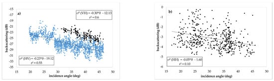 (a) Relationship between open-water backscattered signal (σ0) and incidence angle (θ). IW mode data (VH) were acquired from 80 and 58 orbit overflights, and EW mode data (HV) were acquired from 51, 58, 87, 153, and 160 orbit overflights []. (b) Relationship between flooded forest backscattered signal (σ0) and incidence angle (θ). EW mode data (HH) were acquired from 51, 58, 87, 153, and 160 orbit overflights.