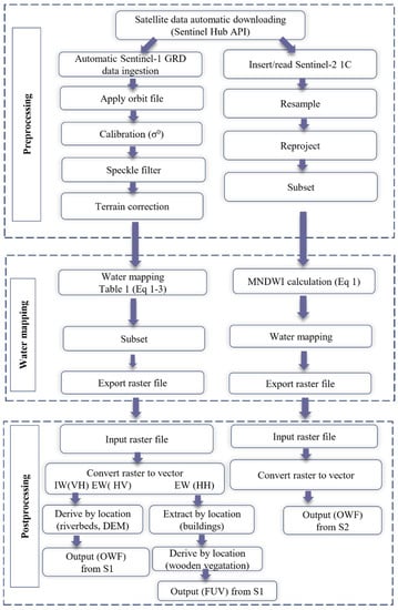 S2 data were used as a validation dataset for an accuracy estimation of the water mapped from S1. S2 data processing is shown in the block scheme in Figure 3. The modified normalized difference water index (MNDWI) was calculated as follows:
