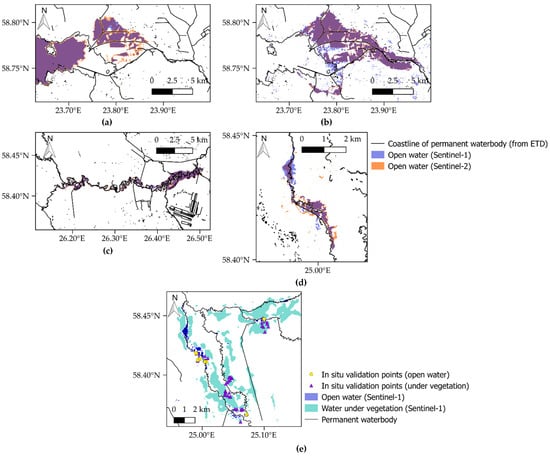 Validation results. (a) Open water mapped from S1 EW HV data vs. S2 MNDWI (4 April 2019), (b) Open water mapped from S1 IW VH data vs. S2 MNDWI (23 March 2019), (c) Open water mapped from S1 IW VH data vs. S2 MNDWI (5 April 2019), (d) Open water mapped from S1 IW VH data vs. S2 MNDWI (16 November 2017) and (e) Comparison of in situ validation points (22 March 2019) with open water mapped from S1 VH data (24 March 2019) and water mapped under vegetation from S1 EW HH data (23 March 2019).