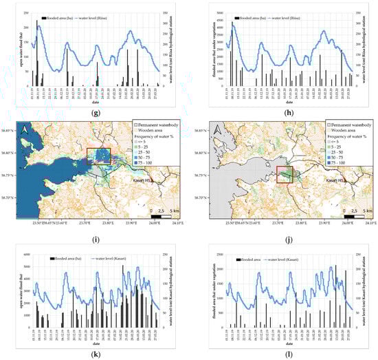 Floods mapped at test sites; (a) Open water frequency (%) at Alam-Pedja, (b) Frequency of water under vegetation (%) at Alam-Pedja, (c) Extent of open-water flood (ha) and water level (cm) at Alam-Pedja, (d) Extent of flood under vegetation (ha) and water level (cm) at Alam-Pedja, (e) Open water frequency (%) at Soomaa, (f) Frequency of water under vegetation (%) at Soomaa, (g) Extent of open-water flood (ha) and water level (cm) at Soomaa, (h) Extent of flood under vegetation (ha) and water level (cm) at Soomaa, (i) Open water frequency (%) at Matsalu, (j) Frequency of water under vegetation (%) at Matsalu, (k) Extent of open-water flood (ha) and water level (cm) at Matsalu, (l) Extent of flood under vegetation (ha) and water level (cm) at Matsalu.