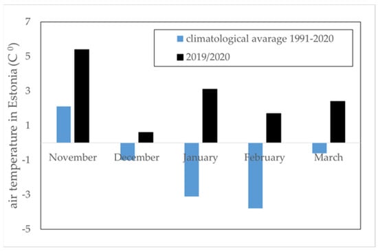 In Figure 5, open water and water under vegetation mapped from S1 data for winter 2019/2020 at our test sites are presented. The winter of 2019/2020 was extremely warm in Estonia. The monthly average temperatures from November 2019 to March 2020 were above zero (Figure 6). Climatological averages for December, January, February, and March have been negative in Estonia in the past (Figure 6). Due to positive air temperatures in the 2019/2020 winter, the soils did not freeze, there was no permanent ice cover on inland waters, and the precipitation was mostly rain. Due to the environmental conditions of winter 2019/2020, open water could be mapped throughout the winter. The flooded area (in hectares—ha) was estimated as the extent of water-covered area outside the official shoreline within the region of interest shown in Figure 1.