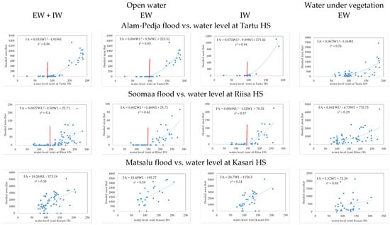 An analysis was performed with the aim of defining the critical water level at the closest hydrological station that indicates the start of a flooding event (shoreline excess), and to find site specific relationships between the measured water level and flood extent. At the Alam-Pedja test site, a polynomial relationship between the flooded area extent and water level measured at the Tartu hydrological station (HS) was observed (Figure 7). The correlation (r2) with water level was most significant (0.94) for the open-water flood extent estimated from IW VH data; the correlation (r2) for EW HV was 0.85 (Figure 7). The r2 between the flooded area extent under vegetation and the water level measured at the Tartu HS was 0.51 (Figure 7). Our analysis indicated that open-water floodings at the Alam-Pedja floodplain occur when the water level at the Tartu HS increases above 120 cm (Figure 7, red line). Additionally, there was a significant correlation (0.51) between the extent of the flooded area under vegetation and the water level measured at the Tartu HS. It was not possible to define the precise critical water level for the Tartu HS at which flooding under vegetation starts (Figure 7).
