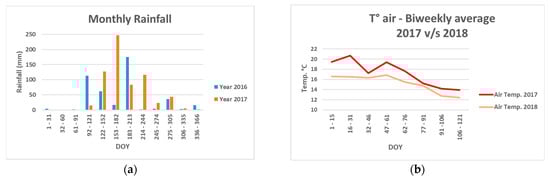 Climatic variables for the 2017 and 2018 seasons: (a) monthly rainfall graph for both seasons with respect to the DOY; (b) biweekly average air temperature for both seasons with respect to the DOY.