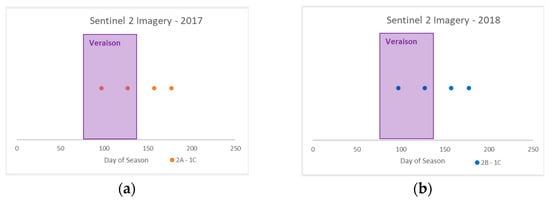 Acquisition dates of the Sentinel-2 images used to model the polyphenols and color intensity. (a) shows images 2017 regarding day of season. (b) shows images 2018 regarding day of season.