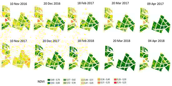 The visualization of the behavior and evolution of the vineyard allows to overview the state of the plots and the development in both seasons. For this purpose, the NDVI was used, since this is considered an indicator related to the quantity, quality and state of vegetation [48]. The best vegetative expression, or the maximum potential of NDVI, occurs in summer shortly before the veraison, since just after this, the foliage begins to change, and near the harvest the vines begin to lose their leaves. The development cycle of the vines begins with pruning and new plantings in July/August, and then starts the flowering in August/September, budding in September/October, flowering in October/November, fruit set in November/December, veraison in January/February and finally the harvest in March/April. Therefore, to characterize the entire cycle of each season, the set of NDVI images used was from September to April.