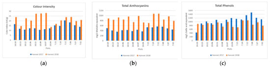 Per plot variable comparison in different seasons: (a) color intensity, (b) total anthocyanins and (c) total phenols.