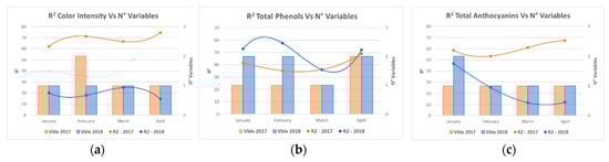 Coefficient of determination (R2) of both seasons versus the number of variables included in the models. R2 represented by lines and variables by bars: (a) color intensity; (b) total phenols; (c) total anthocyanins.