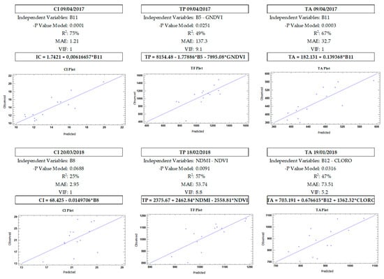 As shown in Figure 7, variables are not repeated in the models with respect to the comparison by variable between the two years. The 2017 season presents two models with one variable (CI and TA) and TP with two variables. In the case of the 2018 season, only CI is selected with one variable and TP and TA with two variables. Regarding the coefficients of determination, only the 2017 season shows reliable models above 60%.