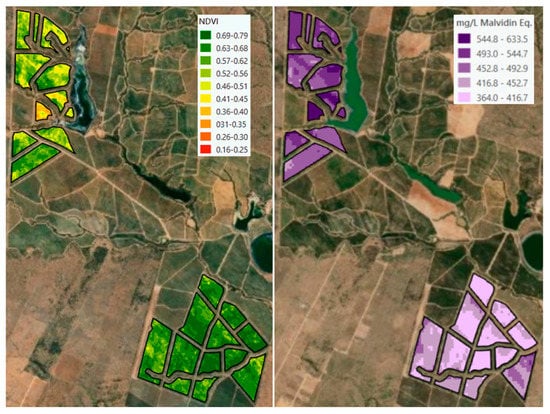 Figure 8 shows comparative maps between the NDVI and estimated total anthocyanins. In agreement with Cortell et al. (2007) [50], who determined that vines with low vigor show higher levels of anthocyanin and flavanol in the grape skin, an inverse relationship between the estimated anthocyanins and NDVI can be noticed.