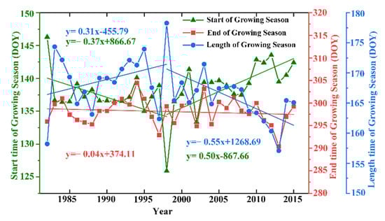 Characteristics of the interannual changes in vegetation phenology. The green, red and blue lines represent the interannual changes in SOS, the EOS, and the LOS, respectively. The blue and green equations at the upper left of the graph represent the interannual changes in 1982 to 1998, respectively. The blue and green equations at the lower right of the graph represent the interannual changes in 1998 to 2015, respectively. The red equation at the lower left represents the interannual changes in 1982 to 2015. Days of Year (DOY) represents the change in the vegetation growing season in the study area.