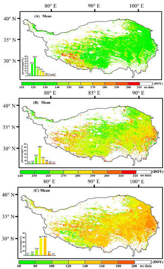 The SOS, the EOS, and the LOS for each pixel in the QTP were calculated using the GIMMS3g NDVI datasets. To calculate the interannual trend in the SOS, the EOS, and the LOS of the study area, a simple linear regression method was used to analyze the interannual trend in each pixel. To detect the trend turning points in the SOS, the EOS, and the LOS at the regional scale, we applied the Mann–Kendall (MK) method test, which is a non-parametric significance test, to statistically assess whether there is a monotonic upward or downward trend in a variable overtime []. Here, this test has been applied to multiple trend analyses of NDVI data []. In our study, a significance level of 0.05 was used. To evaluate the response of the SOS and the EOS to climatic change in different regions during the pre-season, we applied a temporal partial correlation analysis to the SOS, the EOS, pre-season air temperature, and precipitation for all pixels of the different regions in the QTP [].