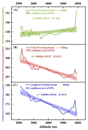 Conversely, the correlation between the EOS, the LOS and the altitude is high (R2 > 0.7). With an increase in altitude, the EOS advances and the LOS decreases. This may be due to the relatively high air temperature at lower altitudes, which is beneficial for delaying leaf senescence and increasing carbon absorption of vegetation []. In other words, altitude promotes a delay in the EOS and lengthens the overall season. However, at higher altitudes, where air temperature is lower, the EOS advances to avoid harm from frost []. Thus, in these areas, there is a shorter growing season.