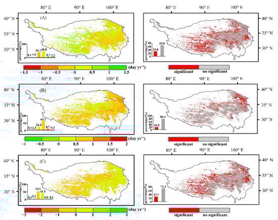 Changes in vegetation phenology during different periods of the growing season. (A–C) represent the trend in the start, the end, and the length of the growing season from 1982 to 2015, respectively. The right side of each trend chart is significant according to the M-K test (p < 0.05). In the lower left of the bar chart, red represents the proportion of the number of regions with a significant trend (p < 0.05). Gray represents the proportion of the number of areas with a non-significant trend.