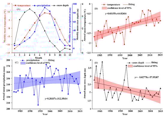 Annual and monthly change in climatic factors. (A) represents the monthly average of air temperature, precipitation and snow depth from 1982 to 2015 in the study area, while (B–D) represent the monthly average of air temperature, precipitation, and snow depth from 1982 to 2015, respectively.