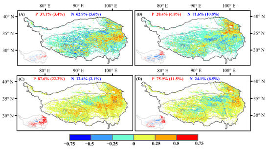 In this paper, the driving forces of the changes in vegetation phenology on the Qinghai–Tibet Plateau were analyzed, but there are still some areas that need to be further explored in-depth. We only analyzed the effects of temperature and precipitation, the main driving forces of vegetation phenology in this region [].We left human factors unexplored, but these also affect vegetation changes; for example, overgrazing, the increase in population, the increase in agricultural production area and fire can affect the vegetation [,,]. In addition, land cover types that are not natural vegetation and errors in the climate datasets maybe also affecting the changes in vegetation phenology.