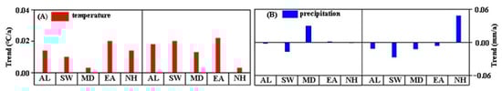 Trends in air temperature and precipitation in different areas of the study area. (A,B) represent the interannual changes in pre-season air temperature and precipitation in different areas of the study area, respectively. The left half of (A) presents the interannual changes in air temperature at the SOS, and the right half presents the interannual changes in air temperature at the EOS. The left half of (B) presents the interannual changes in precipitation at the SOS, and the right half presents the interannual changes in precipitation at the EOS. AL, SW, MD, EA, and NH represent all of and the southwestern, middle, eastern, and northern regions of the study area, respectively.