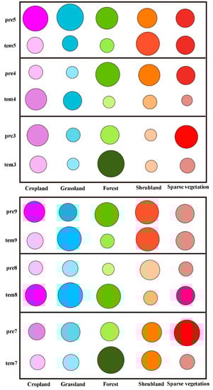 The importance scores of the pre-season climatic factors affecting the SOS and the EOS of different vegetation types during different months. The horizontal axes represent the different vegetation types in the study area. tem3, tem4, and tem5 represent air temperature in March, April, and May from 1982 to 2015, respectively. pre3, pre4, and pre5 represent precipitation in March, April, and May from 1982 to 2015, respectively. tem7, tem8, and tem9 represent air temperature in July, August, and September from 1982 to 2015, respectively. pre7, pre8, and pre9 represent precipitation in July, August, and September from 1982 to 2015, respectively. The colored circle size represents the importance score of different indicators—the larger the circle, the higher the score.