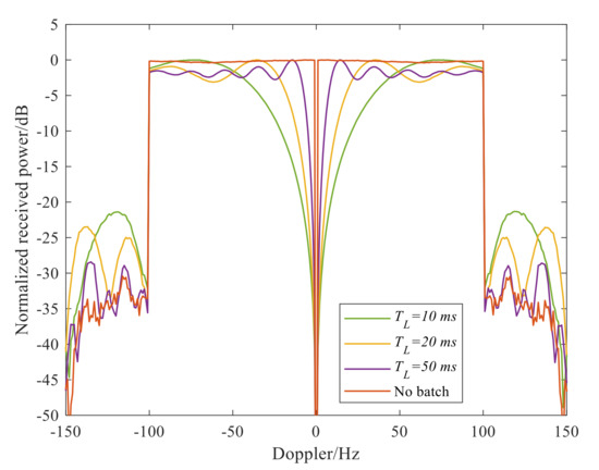 However, the ECA-B method still has the following limitations. Firstly, due to the non-satisfactory cancellation notch feature in the frequency domain, i.e., the transition band falls slowly, the effective width (stop band) of the cancellation notch in the frequency domain is less than 1/TB, where TB is the batch duration. Figure 2 shows the frequency selectivity (the cancellation notch feature in frequency domain) of the ECA-B with different batch durations. In Figure 2, an FM signal is simulated as the direct path signal, at the sampling rate and CPI are fs = 200 kHz and T = 1 s, respectively. It can be shown that, to remove the clutter with a Doppler spectrum bandwidth of 1/TB, the received signal should be divided into smaller batches. However, a smaller batch duration will cause a series of periodic peaks and reduce the target SNR simultaneously; in the case of the slow-moving target, this is close to the transition zone. Figure 3 shows the RD result of a target located in the transition-band in which periodic peaks occur, seriously degrading the detection probability. In Figure 3, the batch duration TB is 10 ms, and the target is located at −28 Hz and in the 50th range bin.