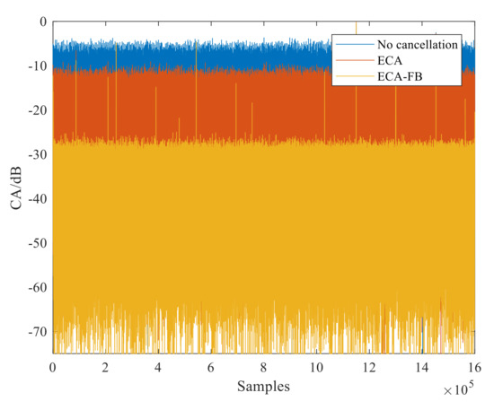 Meanwhile, a generalized subband cancellation (GSC) [32] method is proposed to remove fractional-order clutter by replacing the temporal shift operation with the linear phase modulation in the frequency domain. The essence of this method is still to construct a complete clutter subspace. In addition to being aimed at reducing computational and memory burdens, the ECA by carrier (ECA-C) [33] and its extension ECA by the carrier and Doppler shift (ECA-CD) [25,34] are developed. The undesired components are rejected in each subcarrier with small cost. However, this type of method is only suitable when the transmitted signal adopts an orthogonal frequency division multiplex (OFDM) modulation with cyclic prefix (CP-OFDM), and thus has great limitations.