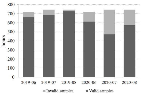 The number (unit: hours) of valid samples and invalid samples in the summer (June, July, and August) during 2019–2020. Valid samples are defined as data that are present in both the AWS and radar QPE data for each hour. Otherwise, the sample was determined to be invalid otherwise and could not be used in the analysis.
