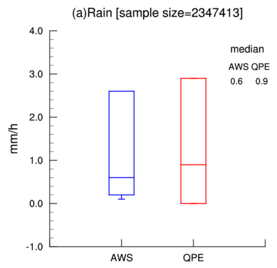 Figure 3 shows the box plot for the hourly rainfall as determined by the AWS rainy observations and the corresponding radar estimations. The median value was 0.6 mm/h for all of the AWS samples, while the median radar QPE value was 0.9 mm/h, indicating that the rainfall amount that was estimated from the radar QPE was generally larger than that of the AWS rainfall amount (Figure 3a). For the 75% quartile value, the rainfall amount that was estimated from the radar QPE was also larger than the AWS rainfall amount. However, the 25% quartile value of the radar QPE was closer to zero, which is smaller than that of the AWS rainfall value (Figure 3a). In addition, a phenomenon was observed wherein the radar was unable to capture any incidence of precipitation at a specific location, even when this location was found to be rainy through AWS observations. These characteristics tended to be contributed rainfall samples that were falling at a rate of less than 20 mm/h (Figure 3b). For heavy rainfall samples with an hourly amount that was larger than 20 mm/h, however, the characteristics were reversed. It was found that the radar QPE often underestimates the precipitation amount for heavy rainfall events, with the median value being shown to be smaller than that of the AWS observations (Figure 3c). It is also true for the 25% and 75% quartile values, which show that the radar QPE often underestimates rainfall amount.