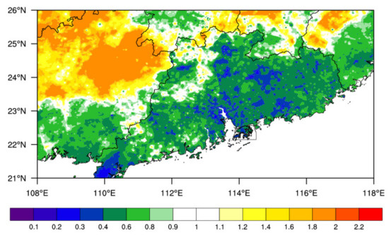 Figure 5 displays the result of the climatic scaling factor field in the South China region that was obtained based on the climatological scaling correction algorithm that was described in Section 2. It should be noted that an empirical maximum of the scaling factor parameter was set as 2.0 in this study in order to avoid excessive correction. This is because in some mountainous regions where the radar beam is shielded by mountains, the radar detecting signal may be very weak or even nonexistent, thus leading to very low and unreasonable precipitation estimations [53,65]. In those regions, the climatological scaling correction algorithm may yield an arbitrarily high scaling factor and may eventually yield corrected questionable precipitation values. It should be noted that the obtained results are generally similar if the maximum scaling factor is set as 2.5 or 3.0 in order to avoid an undesirable effect. Figure 5 clearly shows that the scaling factors are less than one in almost all of the regions that comprise the South China coast, indicating that the radar QPE is usually stronger than the AWS rainfall observations that were determined on a long-term time scale (Figure 5). In contrast, the scaling factors are greater than one in the majority of the regions belonging to north-western South China and some parts of north-eastern South China, demonstrating that radar QPE is often weaker than the rainfall amount that is determined by AWS (Figure 5). The closer the scaling factor is to one, the more accurate the radar rainfall estimation is when determined on a long-term time scale. The distribution of the scaling factor field may be related to the topography of the South China region to some extent (Figure 1 and Figure 5).