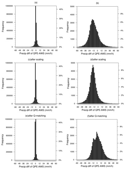 The probability density function of the precipitation difference between QPE and AWS for (a,b) original radar QPE product, (c,d) after correction by scaling, (e,f) and after correction by Q-matching. (a,c,e) are for hourly rainfall samples less than 20 mm/h, and (b,d,f) are for heavy rainfall that are larger than and equal to 20 mm/h.
